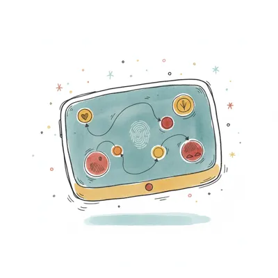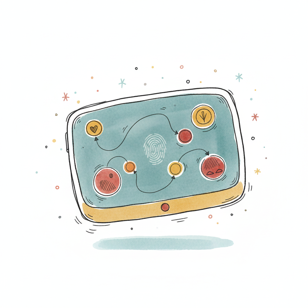 Handgezeichnetes Tablet mit Prozessdarstellung, Fingerabdruck und Symbolen auf dem Bildschirm.