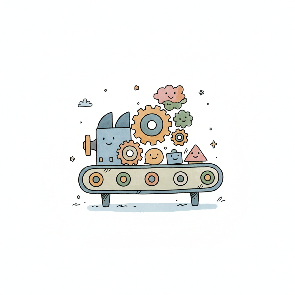 Niedliche Cartoon-Produktionslinie mit lächelnden Zahnrädern und Formen auf einem Förderband.
