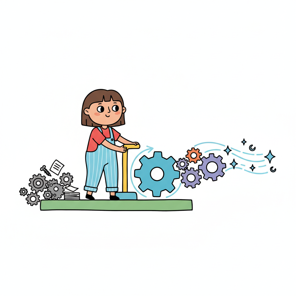 Mädchen bedient Hebel, der Zahnräder antreibt und Chaos in glänzende Ergebnisse verwandelt.