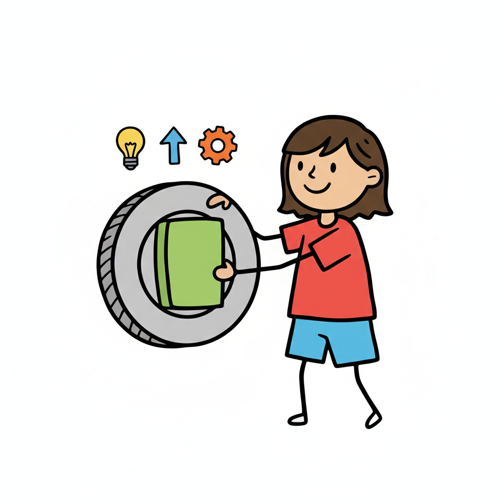 Fröhliche Figur hält Rad/Münze mit grüner Karte, daneben Symbole für Idee, Fortschritt, Prozess.