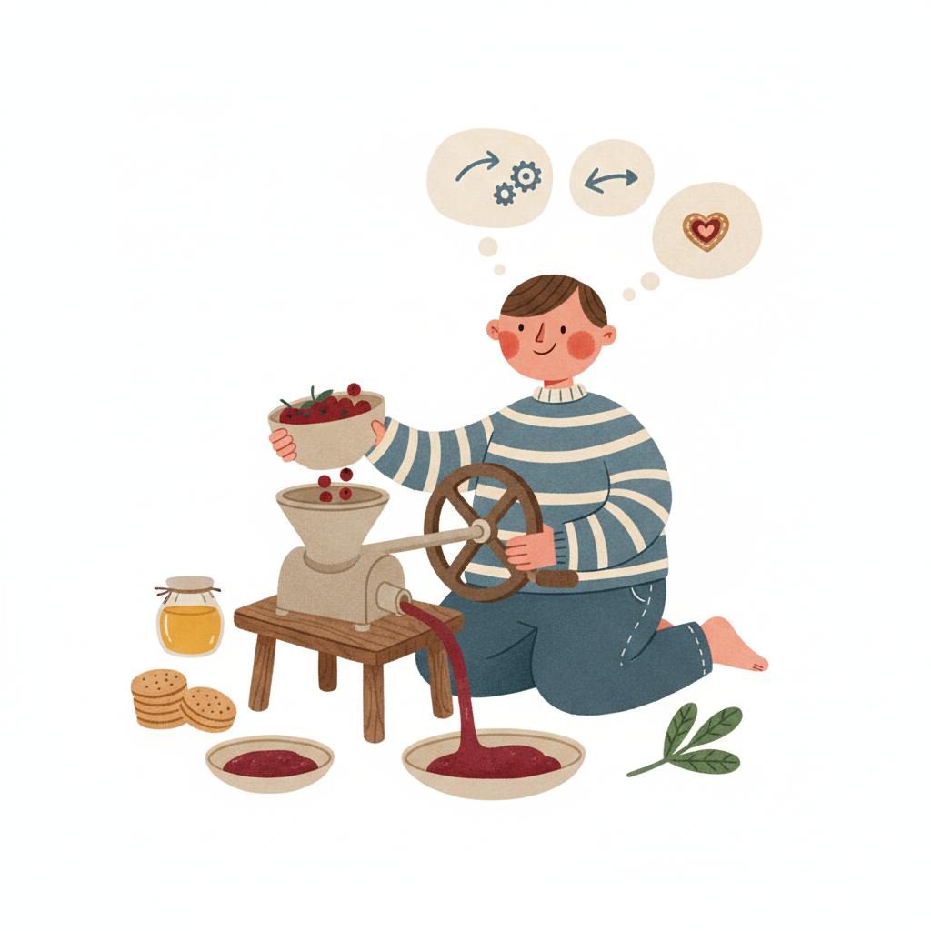 Person macht Kirschmarmelade mit einer Handmaschine, denkt an Prozess und Liebe.