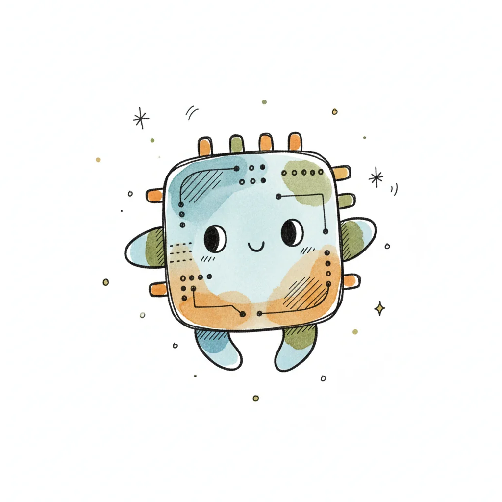 Niedliche, lächelnde Computerchip-Figur im Aquarell-Stil mit Schaltkreismustern und Sternen.