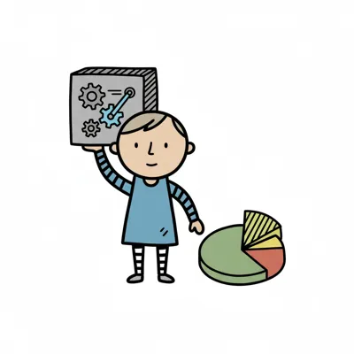 Cartoonfigur hält Würfel mit Zahnrädern und steht neben einem Tortendiagramm.