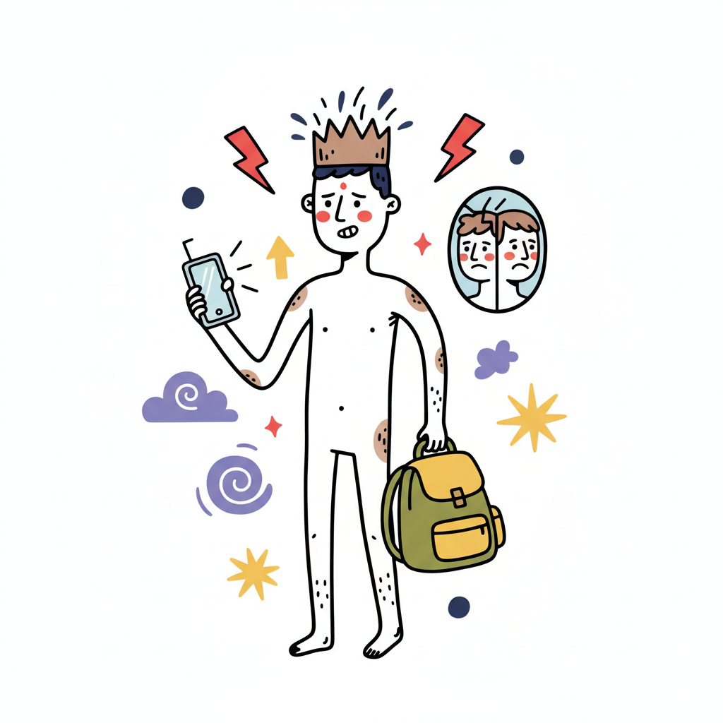 Gestresster Teenager mit Krone, Akne, Smartphone und Rucksack, der sich im Spiegel kritisch sieht.