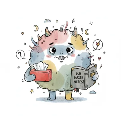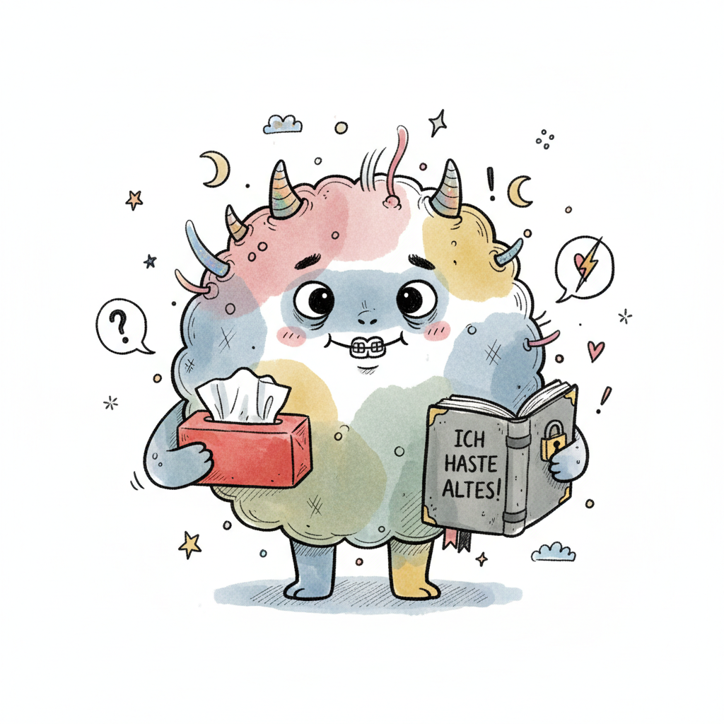 Niedliches, farbiges Monster mit Zahnspange, Taschentuchbox und Buch "ICH HASTE ALTES!".