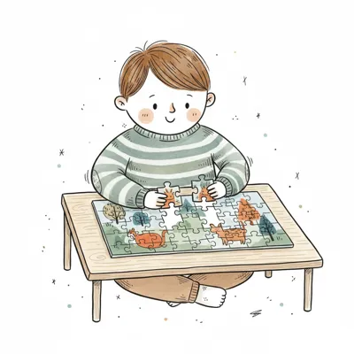 Ein Junge puzzelt an einem Tisch und ist dabei ganz konzentriert.