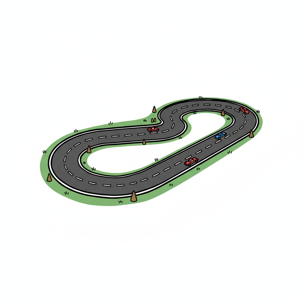 Illustrierte Rennstrecke in Form einer Acht mit kleinen Autos, Pylonen und grünen Rändern.