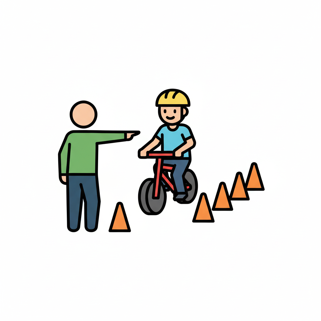 Ein Erwachsener weist ein Kind auf einem Fahrrad an, das zwischen Pylonen fährt.