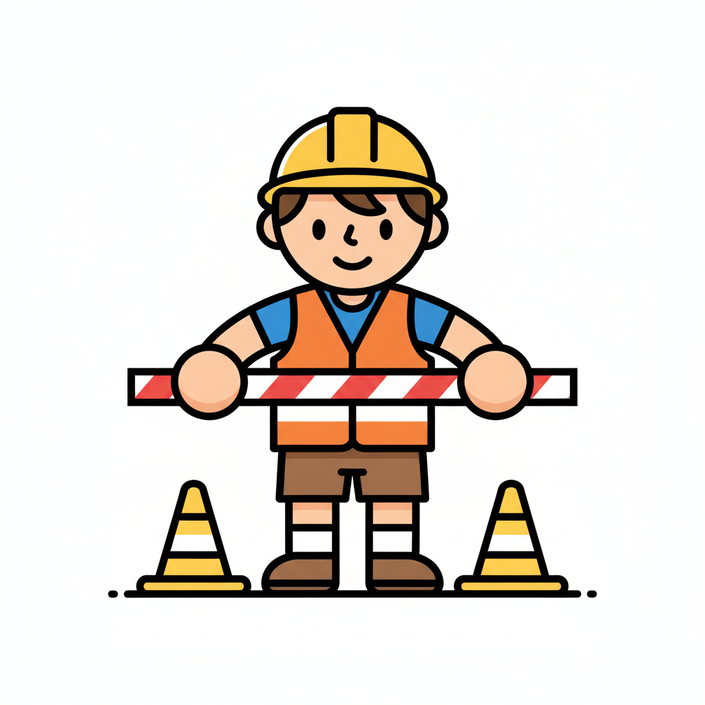 Niedlicher Bauarbeiter-Cartoon mit Helm, Warnweste, Absperrung und zwei Pylonen.