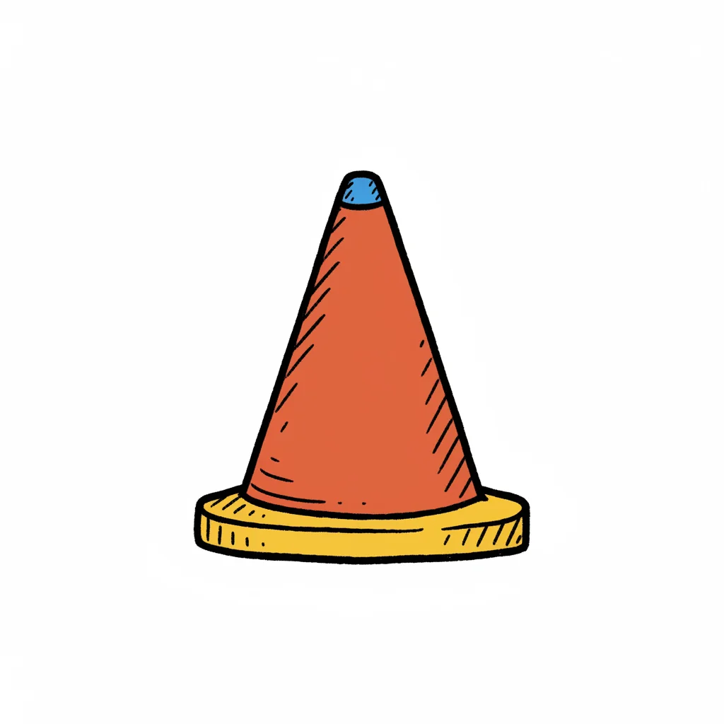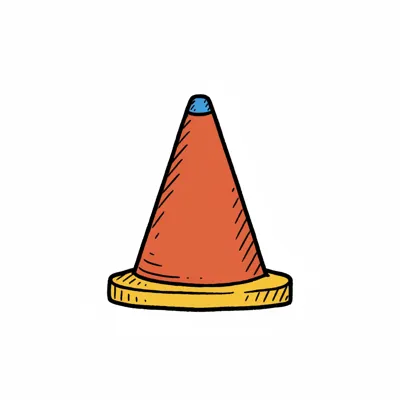 Handgezeichneter oranger Verkehrskegel mit gelbem Sockel und blauer Spitze auf weißem Hintergrund.