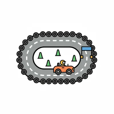 Illustrierte Rennstrecke mit kleinem Auto, Fahrer, Pylonen und Zielflagge, umgeben von einer Kette.