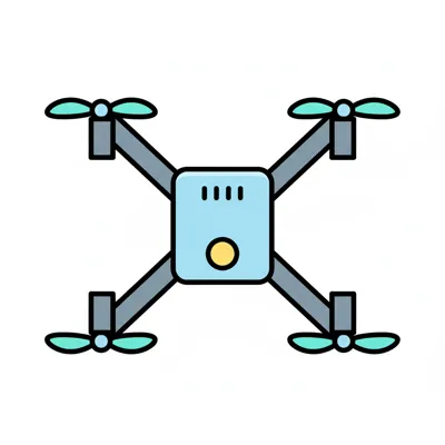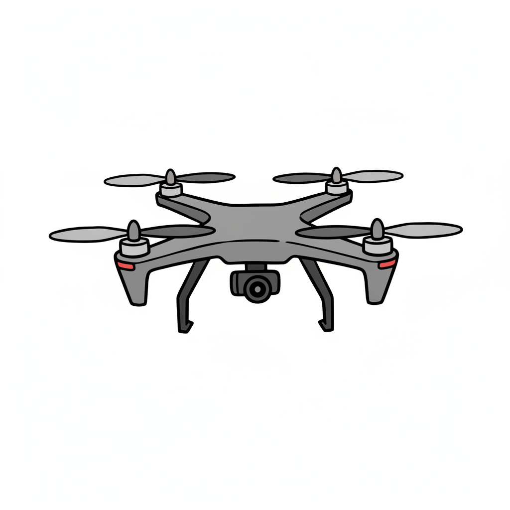 Illustration einer Drohne mit vier Rotoren und einer Frontkamera in Cartoon-Stil.