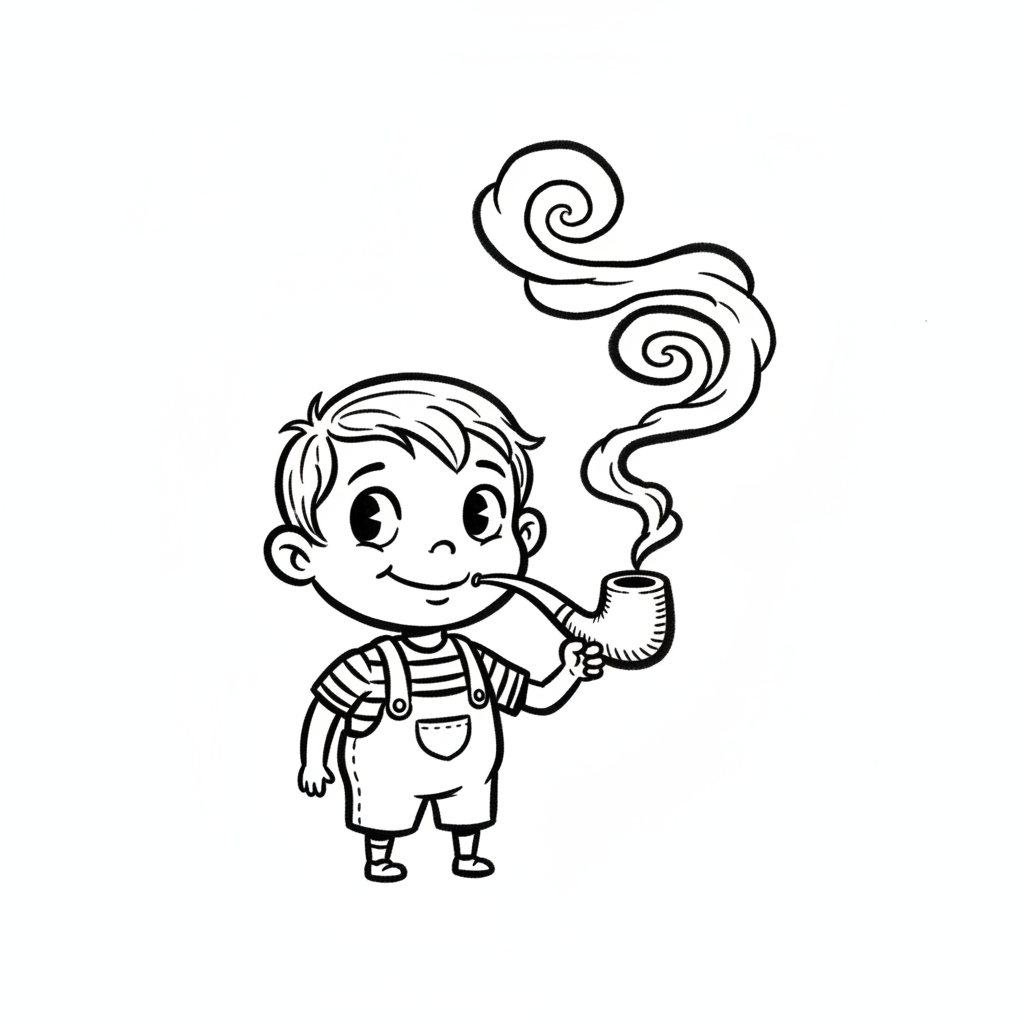 Schwarz-weiß-Zeichnung eines lächelnden Jungen mit Latzhose, der eine rauchende Pfeife hält.