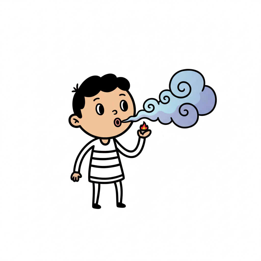 Cartoon-Junge bläst Rauch aus einer Flamme in seiner Hand.