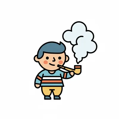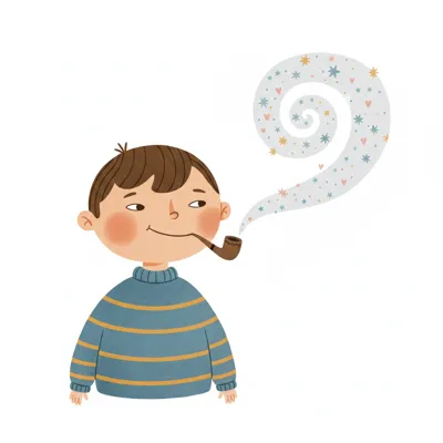 Ein Cartoon-Junge mit Pfeife, aus der Rauch mit Sternen und Herzen aufsteigt, trägt einen gestreiften Pullover.