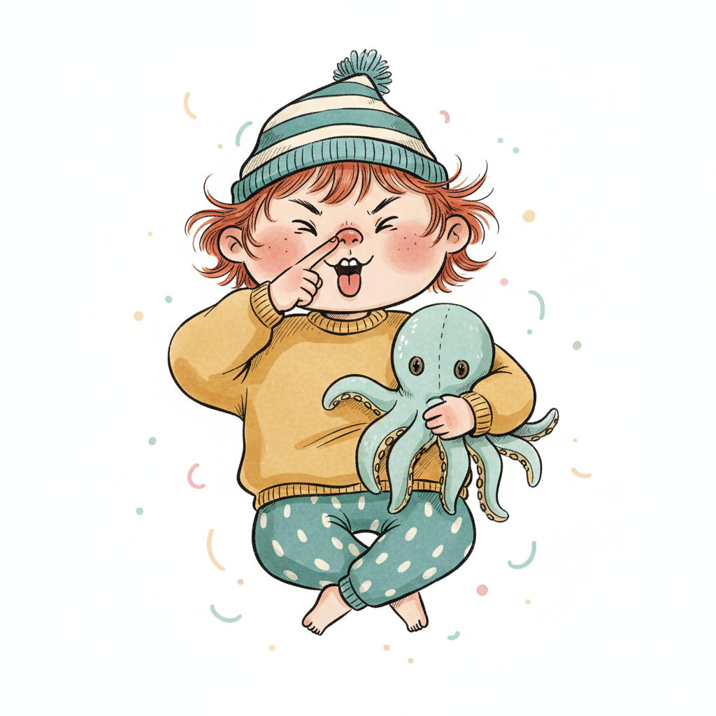 Niedliche, kindgerecht illustrierte Szene mit einem Kind oder einer Person als Hauptfigur, vor rein weißem Hintergrund, im frech-nordischen Aquarell-Skizzenstil. Klare, leicht wackelige Tuschekonturen, sichtbare Pinsel- und Strichtextur, dezente Schraffuren, weiche handgemalte Farbflächen in gedeckten Farben. Einfache, runde Formen. Keine harten Schatten, sondern sanfte, transparente Aquarellschichten. Leicht raue, handgezeichnete Linien statt glatter Vektorkanten. Subtile, vereinzelte Kritzelpunkte oder kleine Details im Hintergrund (wie Pünktchen oder feine Striche), aber keine echte Umgebung oder Landschaft. Die Figur ist mittig zentriert. Insgesamt charmant, humorvoll, warm und handgemacht wirkend. WICHTIG: Das Bild darf ABSOLUT KEINEN TEXT, KEINE BUCHSTABEN und KEINE ZAHLEN enthalten.