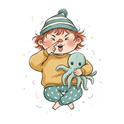 Ein fröhliches Kind mit einem Oktopus und gestreiftem Hut.