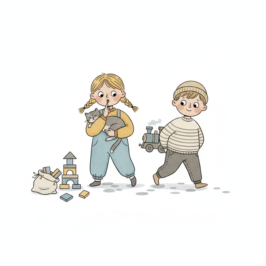 Zwei Kinder spielen: Mädchen mit Katze shusht, Junge mit Eisenbahn. Spielzeug liegt bereit.
