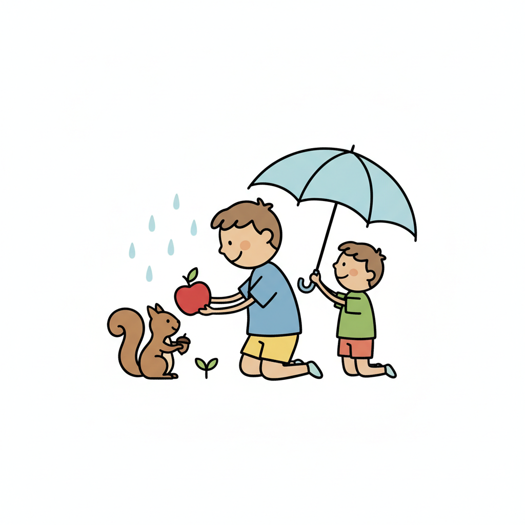 Ein Junge füttert ein Eichhörnchen mit einem Apfel, während ein anderer ihn mit einem Schirm schützt.