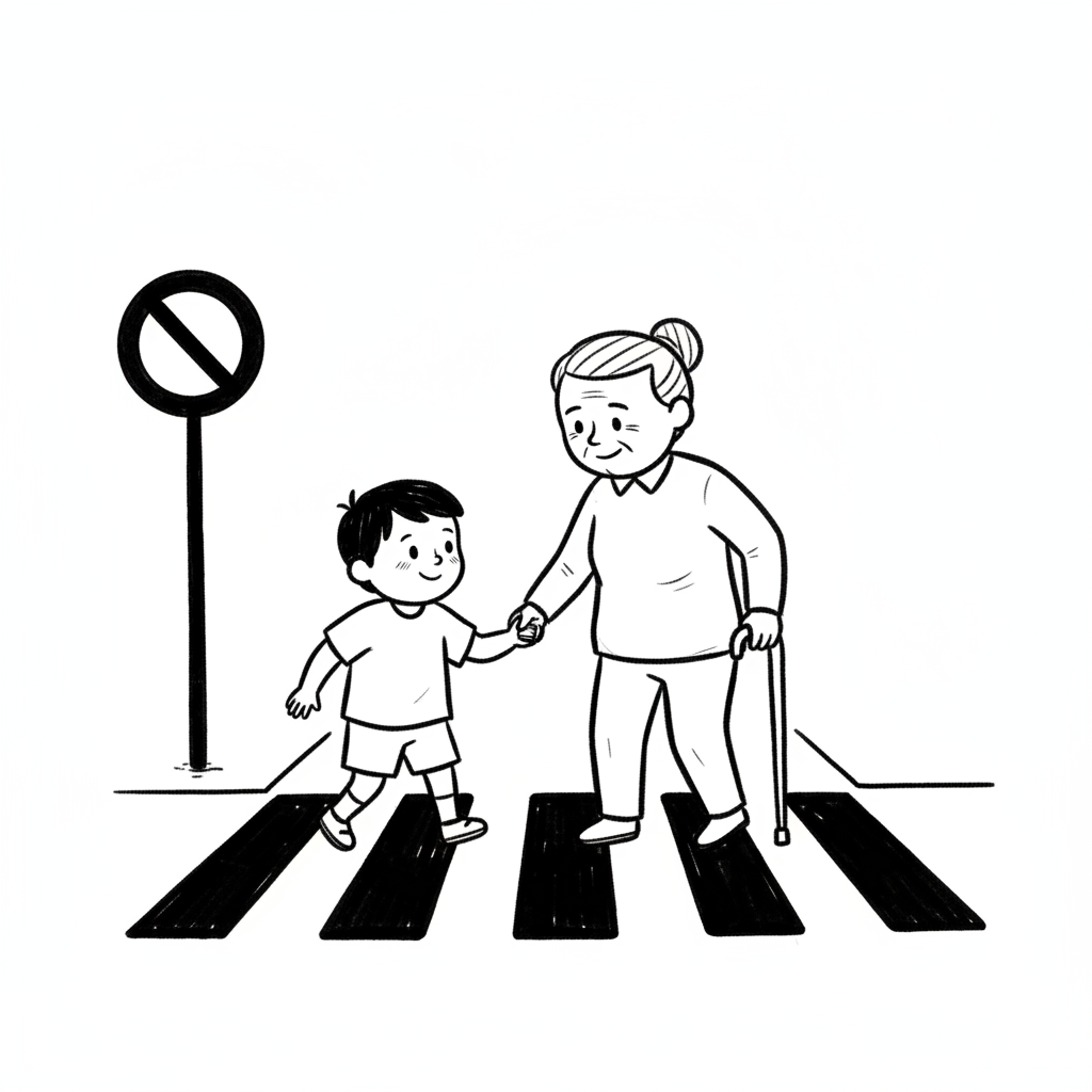 Ein Junge hilft einer älteren Frau mit Gehstock, sicher einen Zebrastreifen zu überqueren.