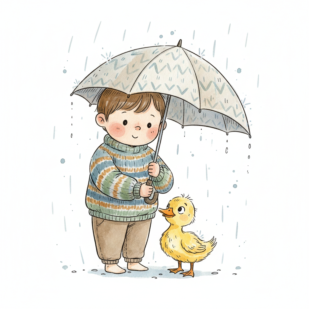 Ein kleiner Junge schützt ein Entenküken mit einem Regenschirm vor dem Regen.