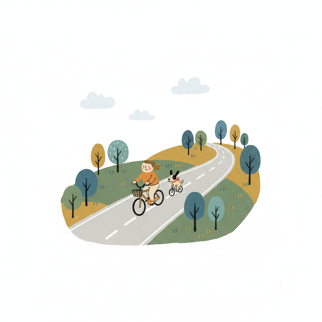 Illustration: Person und Hund fahren Fahrrad auf einer kurvigen Straße durch eine hügelige Landschaft.