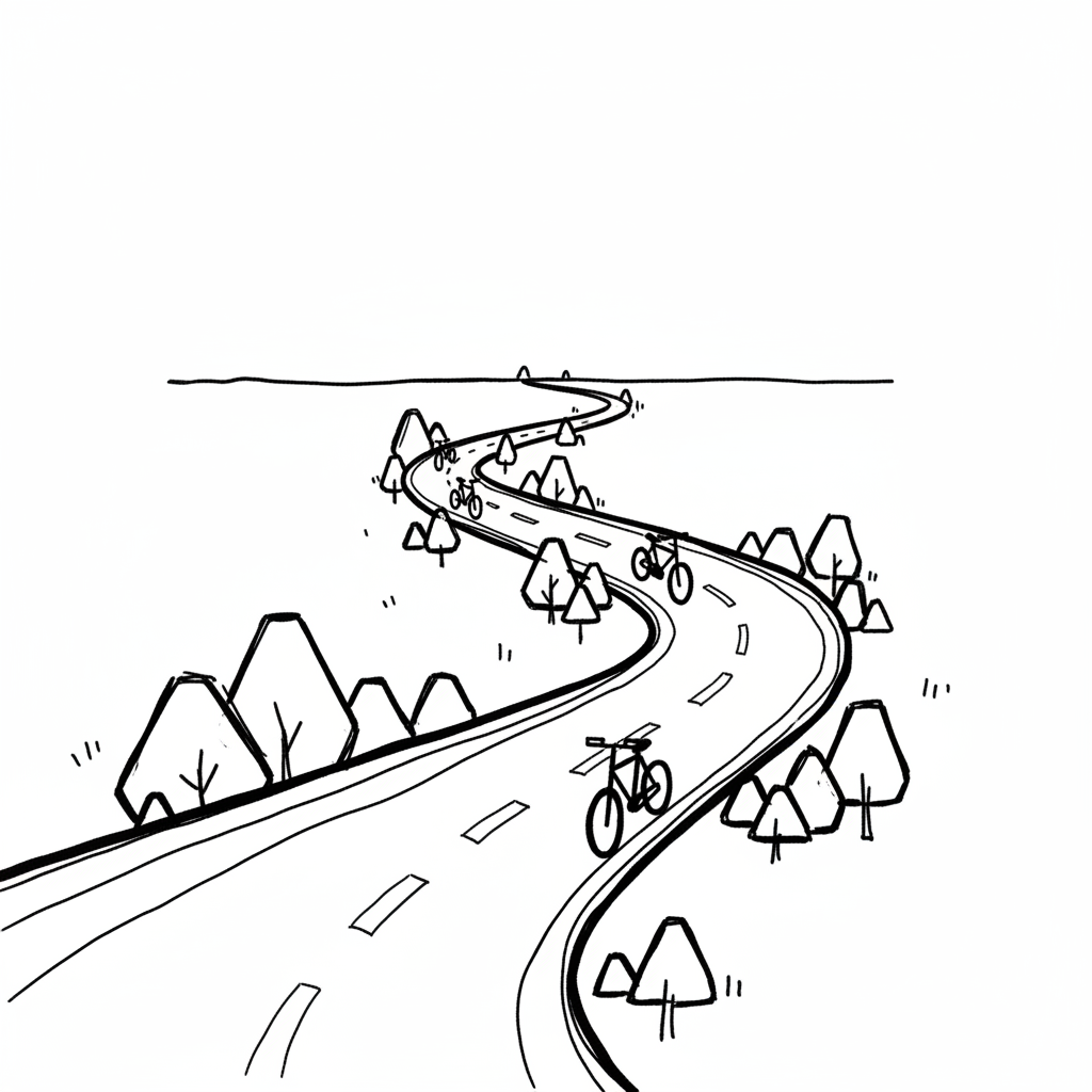 Schwarz-weiße Skizze einer kurvigen Straße mit Bäumen und Fahrrädern am Rand.