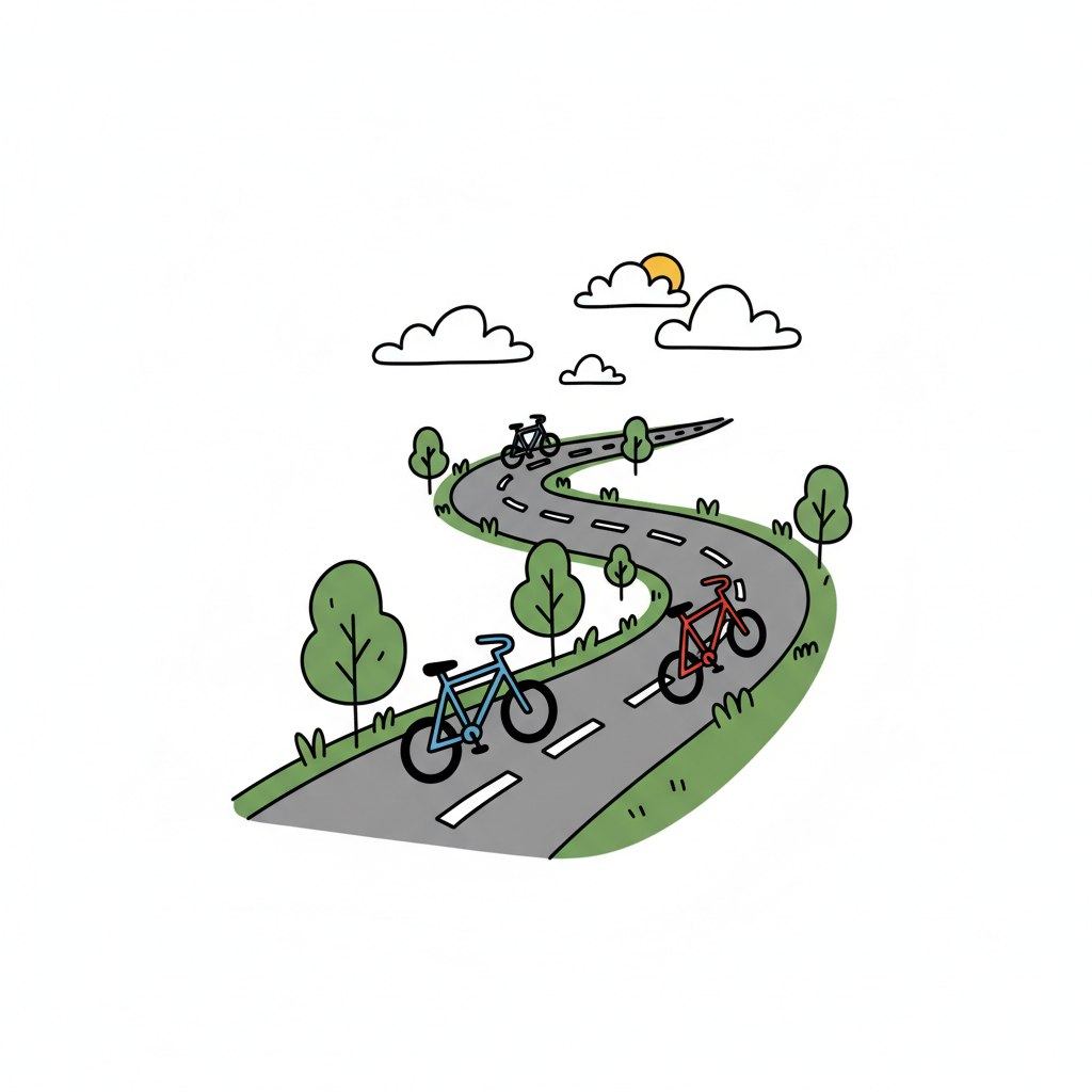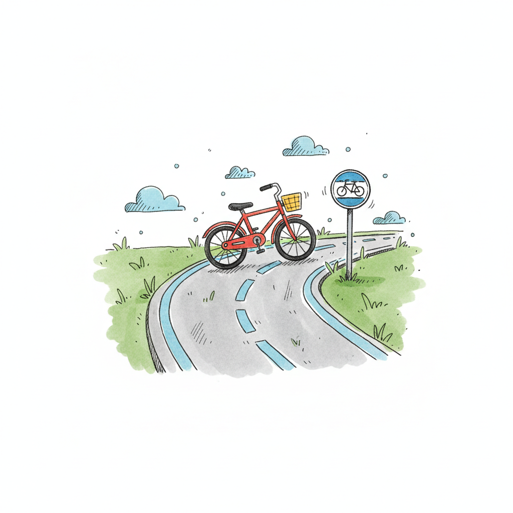 Cartoon eines roten Fahrrads auf einem gewundenen Radweg mit Schild unter blauem Himmel.
