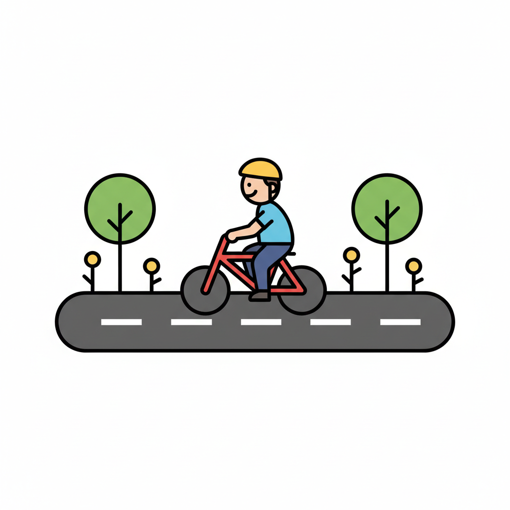 Illustration: Person mit Helm fährt Fahrrad auf Straße mit Bäumen und Blumen.