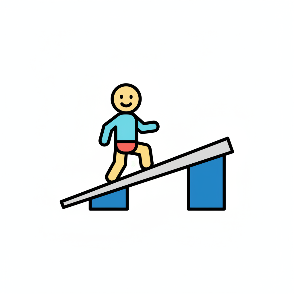 Ein lächelndes Männchen steigt eine schräge Rampe hinauf, unterstützt von blauen Blöcken.