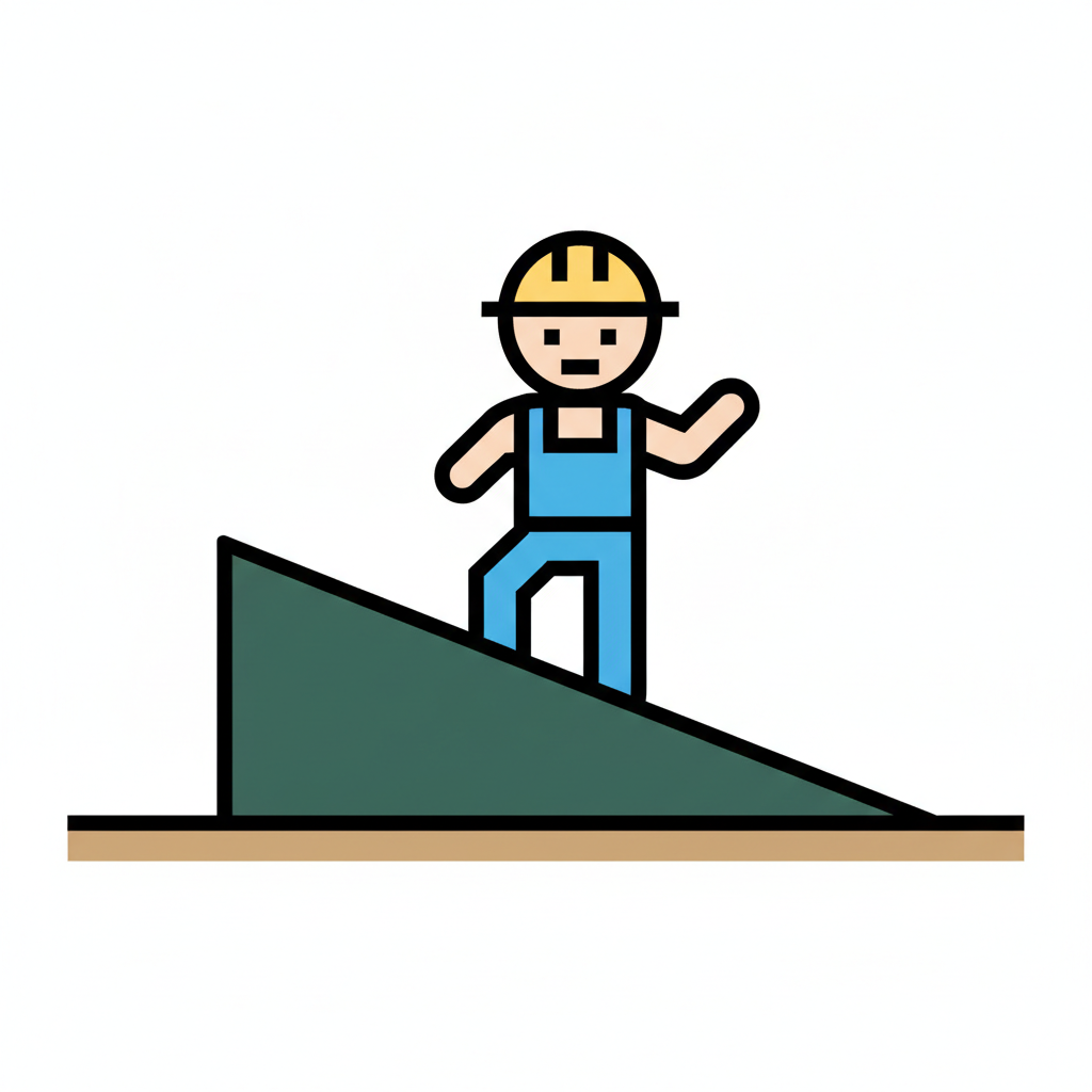 Stilisierter Arbeiter mit gelbem Helm und blauer Latzhose steht auf einer grünen Rampe.