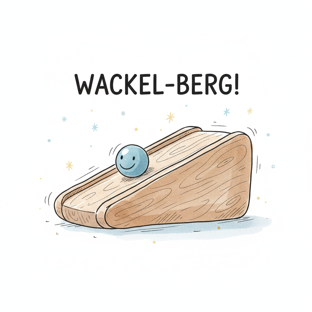 Ein lächelnder Ball auf einer wackeligen Holzrampe mit dem Text "WACKEL-BERG!".
