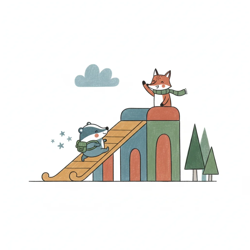 Niedlicher Dachs klettert Rampe hoch, Fuchs winkt von Spielturm. Eine fröhliche Tierillustration.