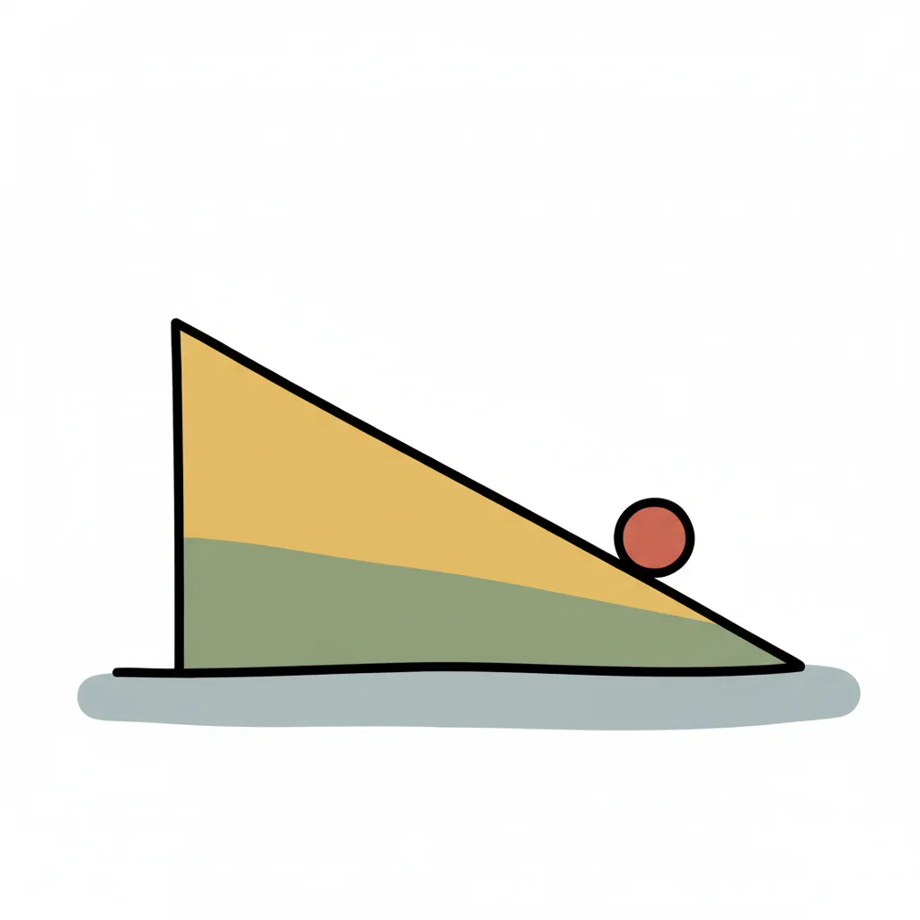 Minimalistische Zeichnung einer roten Kugel auf einer gelb-grünen Rampe.