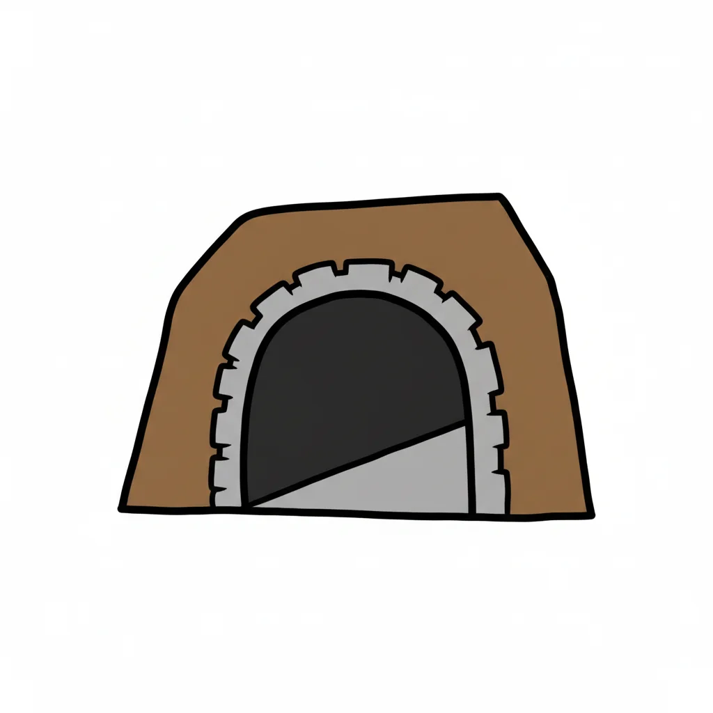 Cartoon-Darstellung eines Tunnels mit gemauertem Eingang und Rampe, umgeben von Erde.