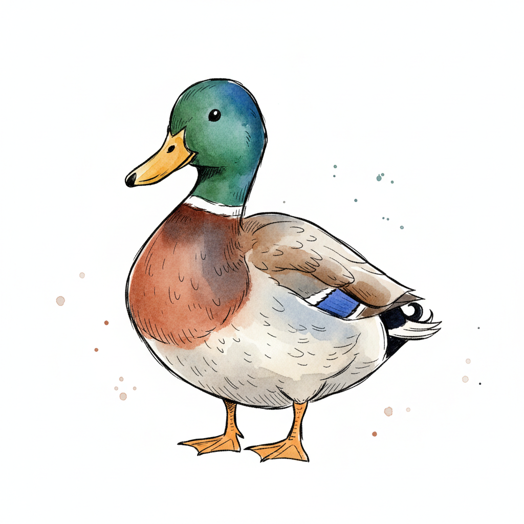 Farbige Aquarell-Illustration einer männlichen Stockente mit grünem Kopf und brauner Brust.