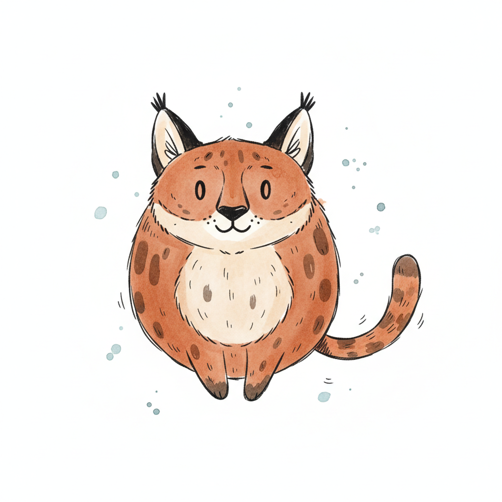 Süße, runde Cartoon-Luchs-Illustration mit braunem Fell und Punkten.