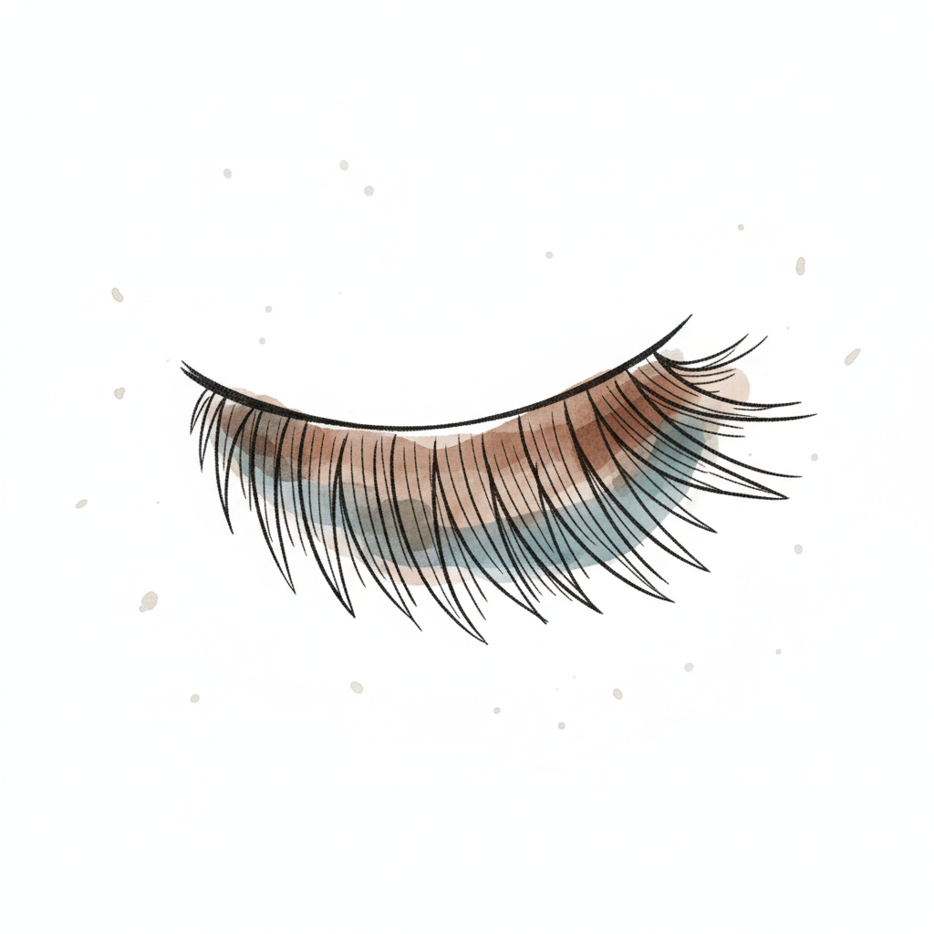 Aquarellzeichnung einer geschlossenen Wimpernreihe in Braun- und Blautönen auf weißem Grund.