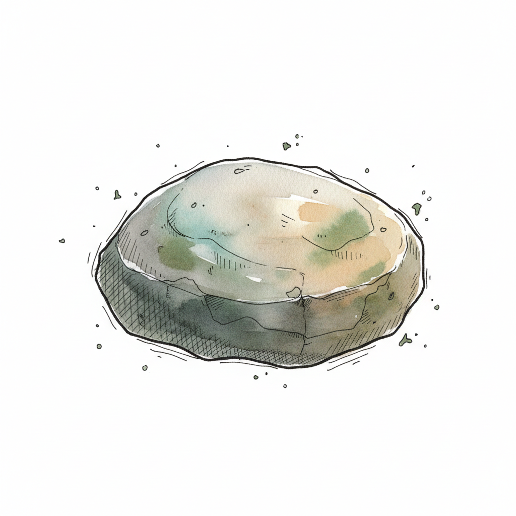 Aquarellzeichnung eines flachen, runden Steins mit grünen und braunen Farbtönen.