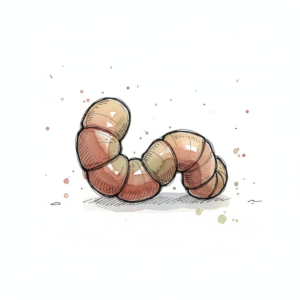 Illustration eines segmentierten, rötlich-braunen Wurms im Aquarellstil mit Tuschekonturen.