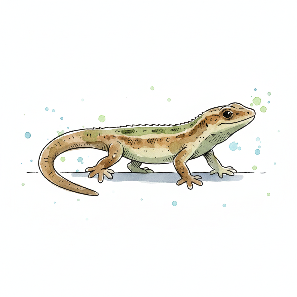 Aquarell-Illustration einer braun-grün gestreiften Eidechse auf weißem Hintergrund.