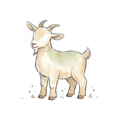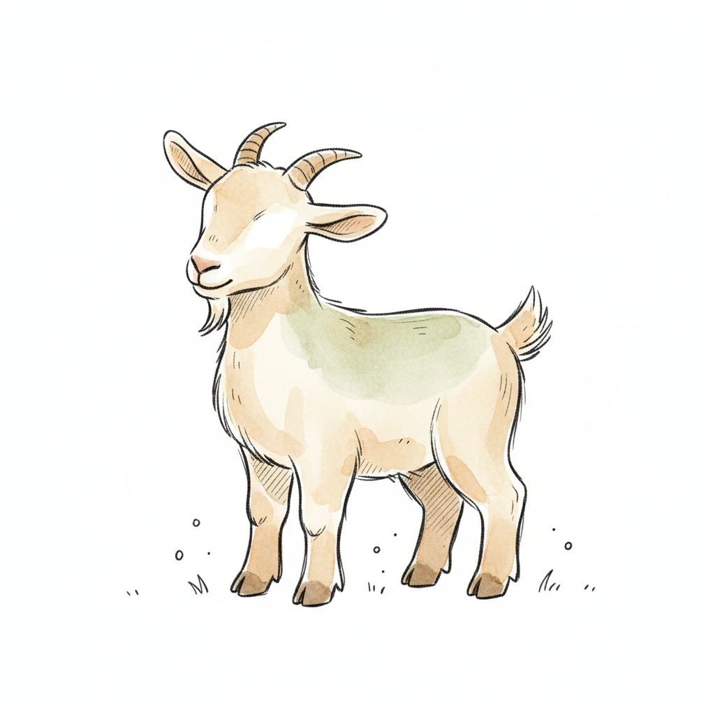 Eine niedliche, hellbraune Ziege mit Hörnern und Bart, gezeichnet im Aquarellstil auf weißem Hintergrund.