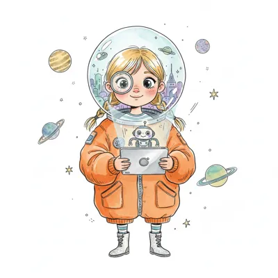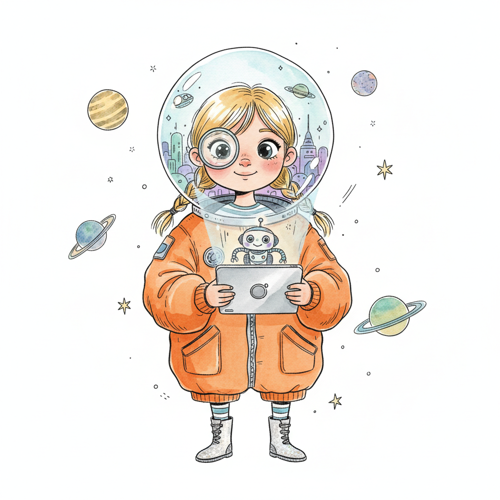Blondes Mädchen im Astronautenanzug hält Tablet mit Roboter, umgeben von Planeten und Sternen.