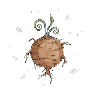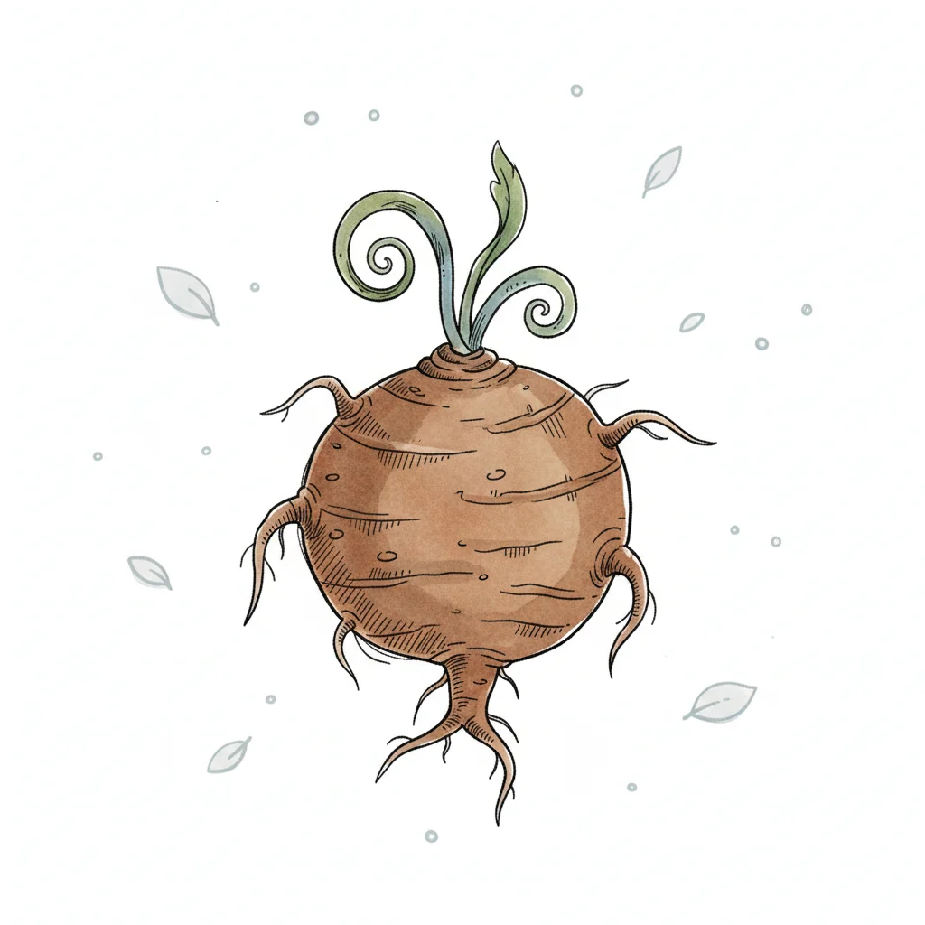 Watercolor-Illustration einer braunen Wurzelknolle mit grünen, spiralförmigen Blättern und feinen Wurzeln.