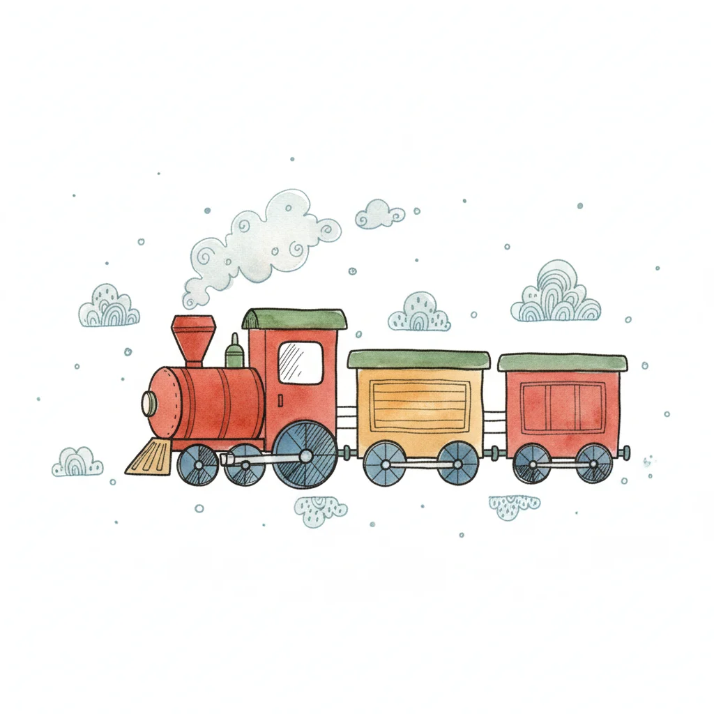 Niedliche Aquarell-Illustration eines roten Spielzeugzugs mit zwei Waggons und Rauchwolken.