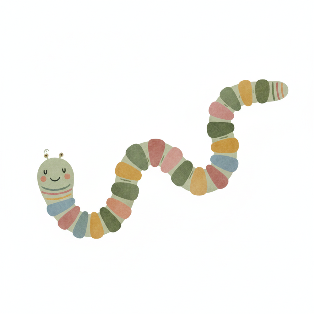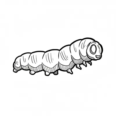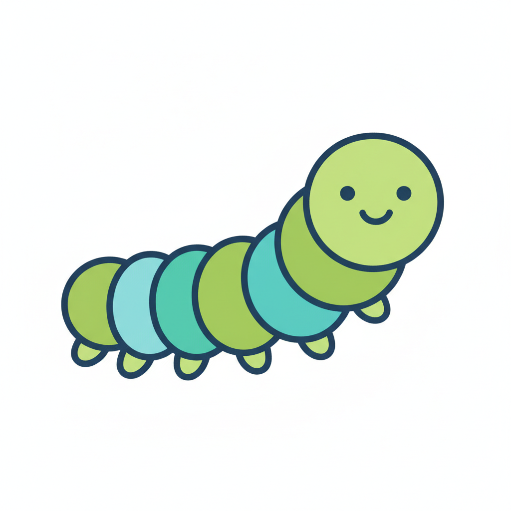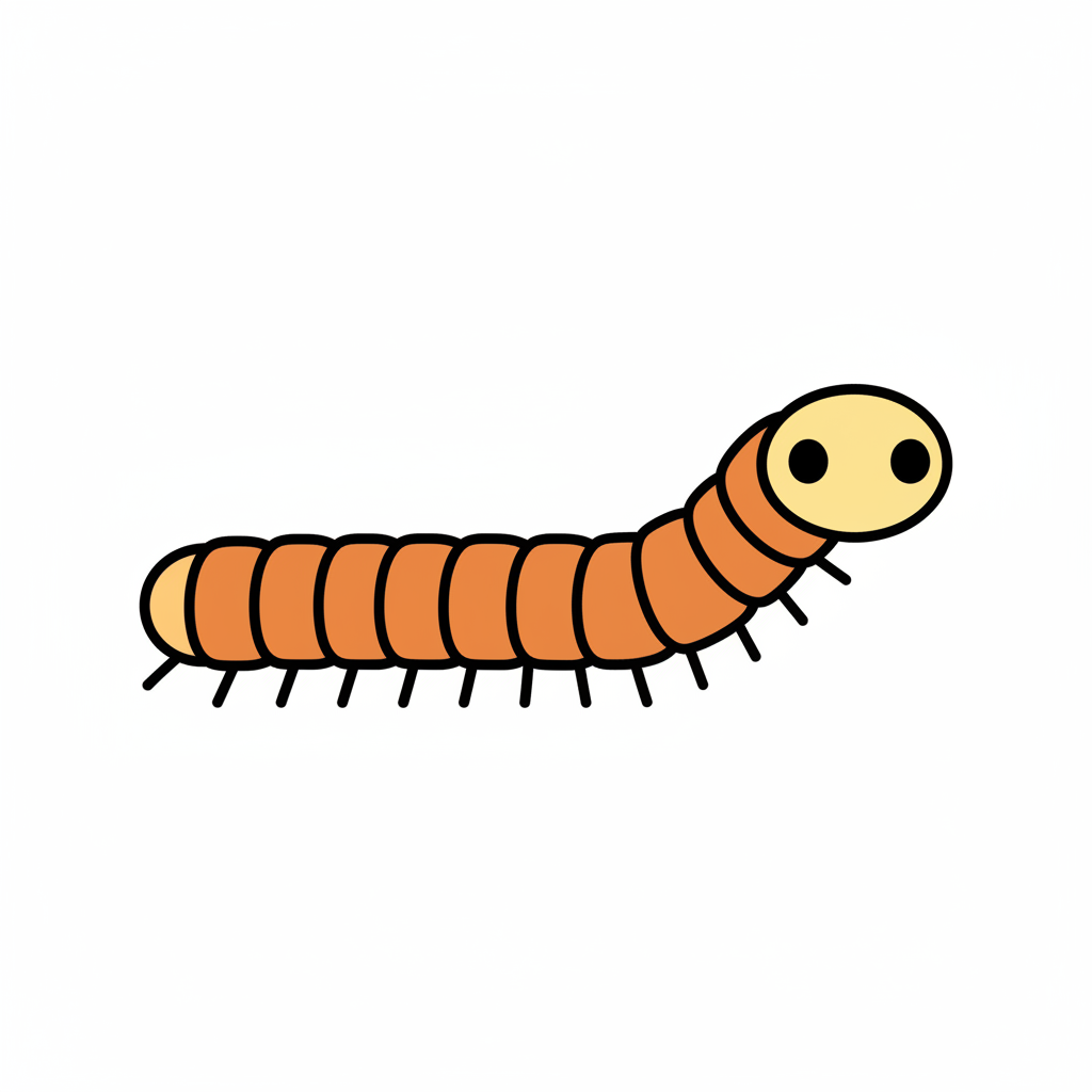 Eine cartoonhafte Raupe mit großen Augen und segmentiertem Körper.