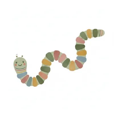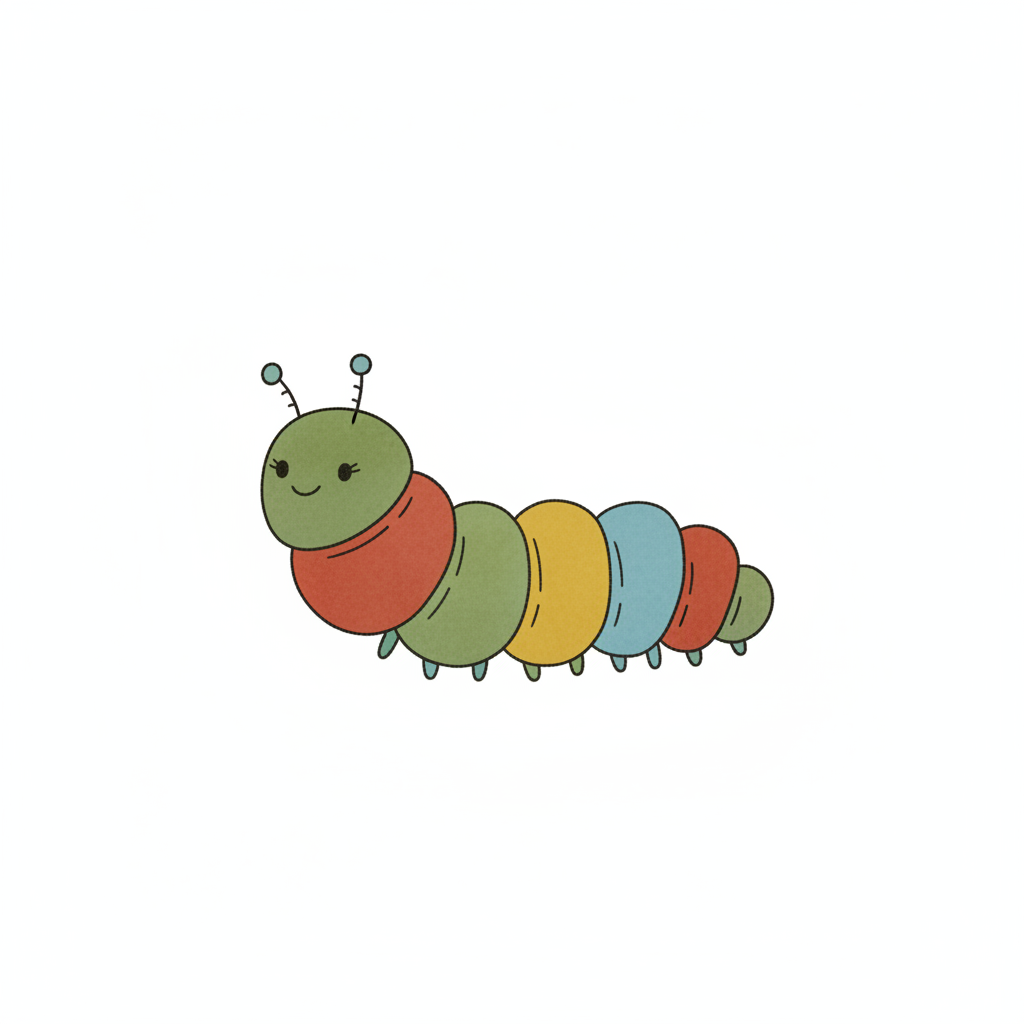 Eine bunte, cartoonartige Raupe mit einem lächelnden Gesicht.