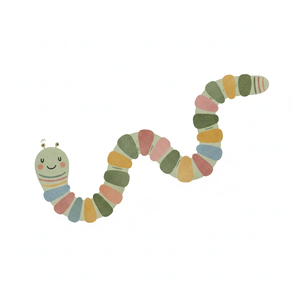 Eine bunte, lächelnde Raupe mit runden Segmenten.