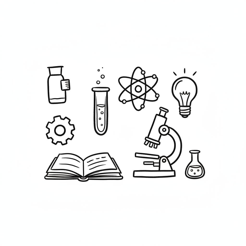 Handgezeichnete Icons für Wissenschaft und Bildung: Reagenzglas, Mikroskop, Atom, Buch, Glühbirne.