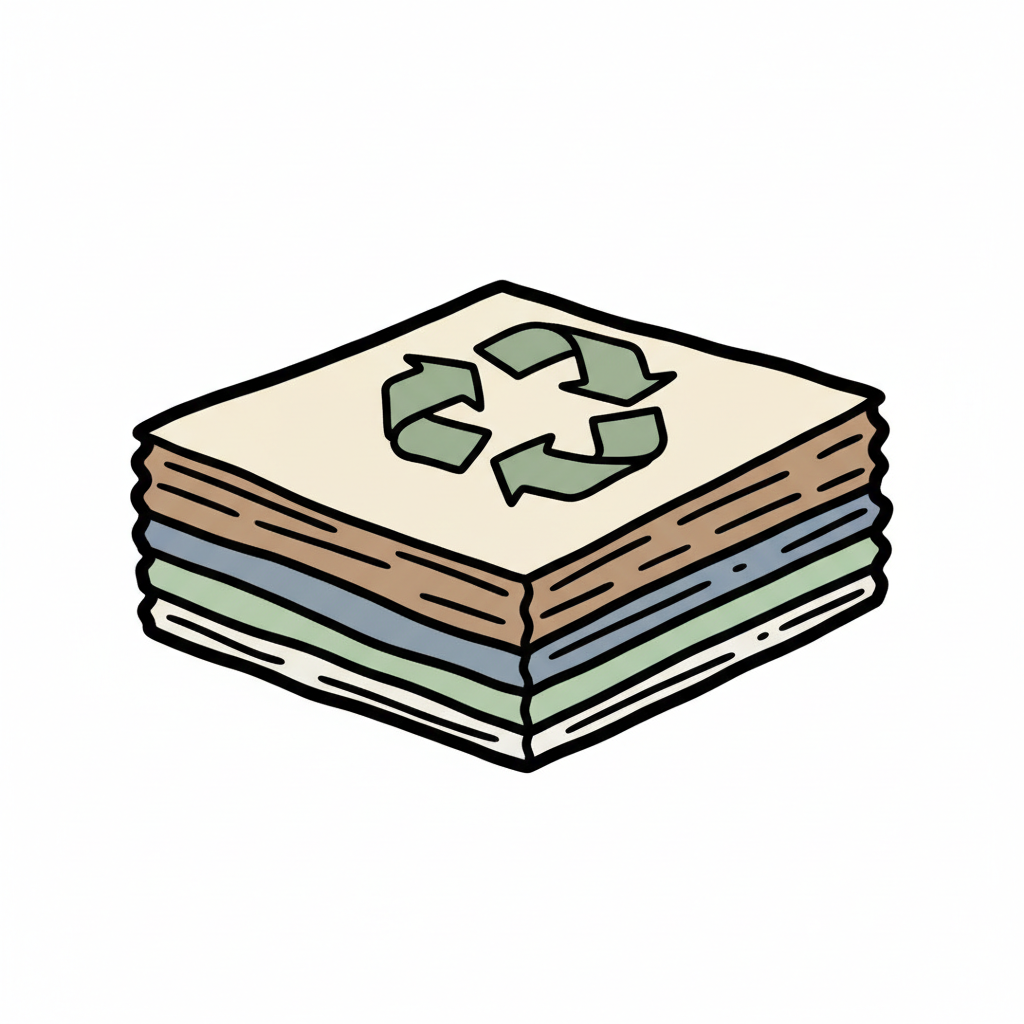 Aquarell-Illustration eines hohen Stapels Recyclingpapier mit der Aufschrift 'RECYCLED PAPER'.